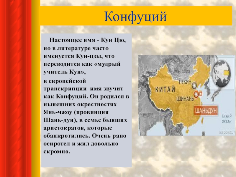 европейской транскрипции имя звучит как Конфуций. Он родился в нынешних окрестностях Янь-чжоу (провинция Шань-дун), в семье бывших аристократов, которые обанкротились. Очень рано осиротел и жил довольно скромно.
