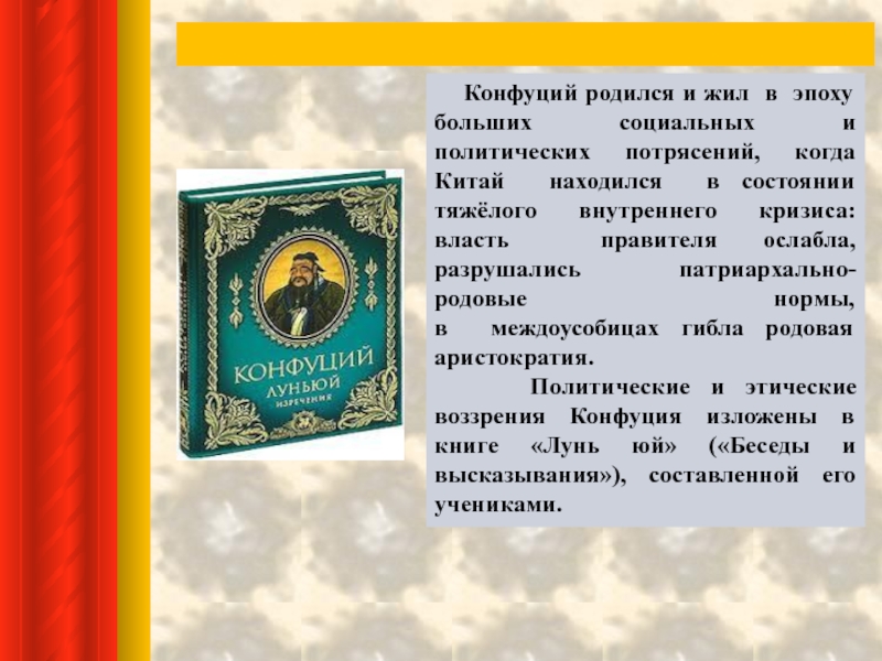 Политические и этические воззрения Конфуция изложены в книге «Лунь юй» («Беседы и высказывания»), составленной его учениками.