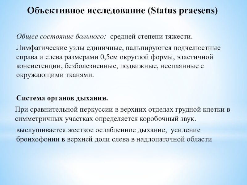 данных объективного исследования: состояние средней степени тяжести. Голосовое дрожание усиленно в верхних отделах легких. При сравнительной перкуссии в верхних отделах грудной клетки в симметричных участках определяется коробочный звук. При аускультации выслушивается ослабленное жесткое дыхание, усиление бронхофонии в верхних отделах легких, мелкопузырчатые хрипы в надлопаточной области.