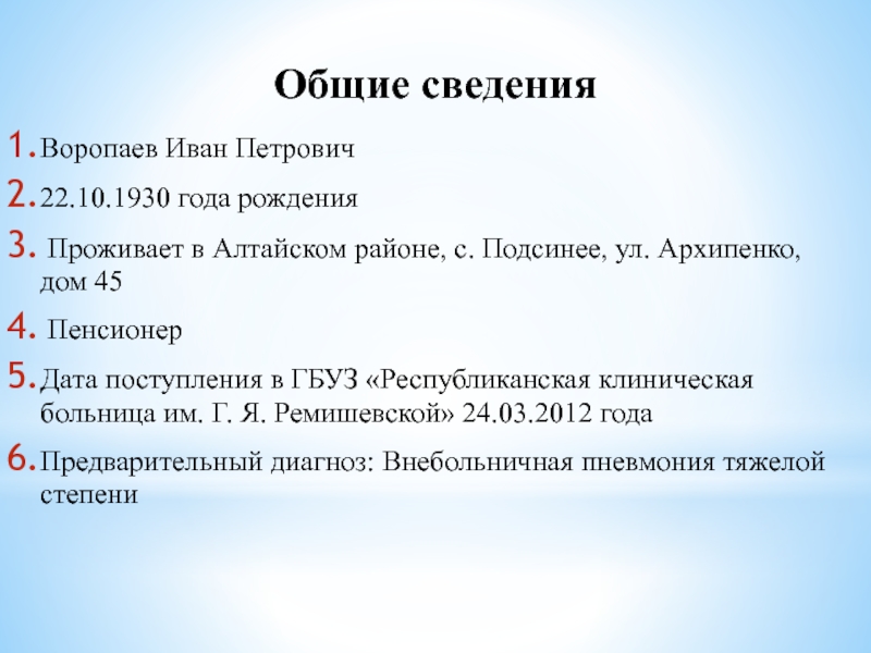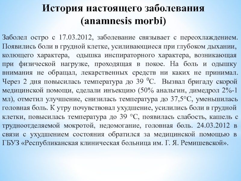 дыхании, колющего характера, одышка инспираторного характера, возникающая при физической нагрузке, проходящая в покое. На боль и одышку внимания не обращал, лекарственных средств ни каких не принимал. Через 2 дня повысилась температура до 39 0С. Вызвал бригаду скорой медицинской помощи, сделали инъекцию (50% анальгин, димедрол 2%-1мл), отметил улучшение, снизилась температура до 37,5°С, уменьшилась головная боль. К утру почувствовал ухудшение, усилились боли в грудной клетки, повысилась температура до 39 °С, появилась слабость, кашель с трудноотделяемой мокротой, недомогание, головная боль. 24.03.2012 в связи с ухудшением состояния обратился за медицинской помощью в ГБУЗ «Республиканская клиническая больница им. Г. Я. Ремишевской».