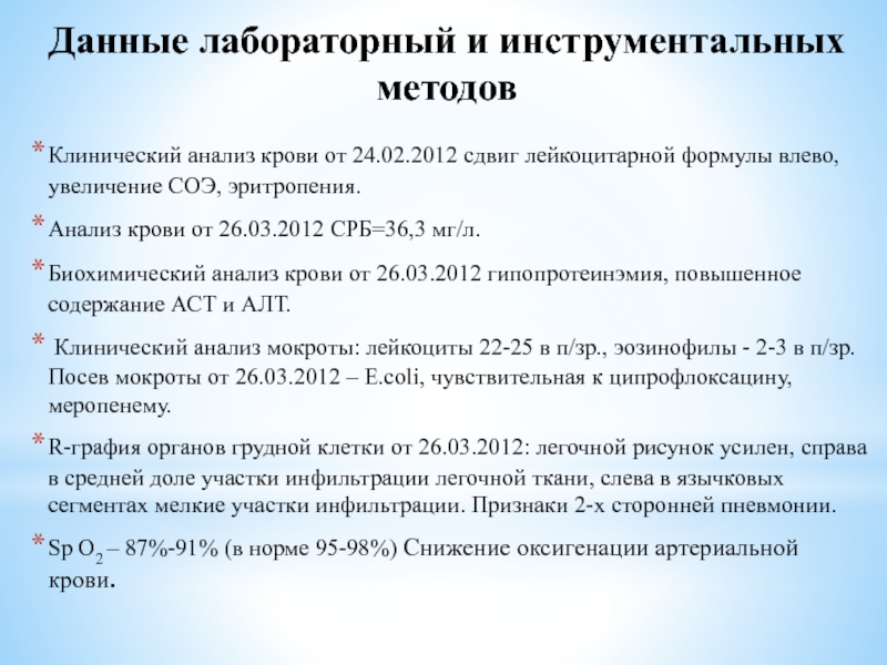 лабораторных и инструментальных данных: клинический анализ крови от 24.02.2012 сдвиг лейкоцитарной формулы влево, увеличение СОЭ. Анализ крови от 26.03.2012 СРБ=36,3 мг/л. Биохимический анализ крови от 26.03.2012 гипопротеинэмия, повышенное содержание АСТ и АЛТ. Клинический анализ мокроты: лейкоциты 22-25 в п/зр., эозинофилы - 2-3 в п/зр. Посев мокроты от 26.03.2012 – E.coli, чувствительная к ципрофлоксацину, меропенему.