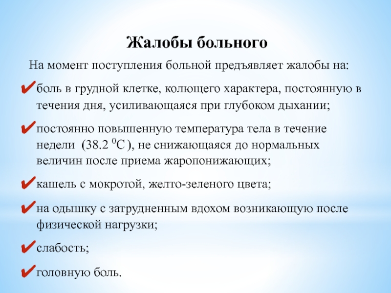 клетке, колющего характера, постоянная в течения дня, усиливающаяся при глубоком дыхании; кашель с мокротой, желто-зеленого цвета; постоянно повышенную температура тела в течении недели (38.2 0С ), не снижающаяся до нормальных величин после приема жаропонижающих; на одышку (инспираторную);