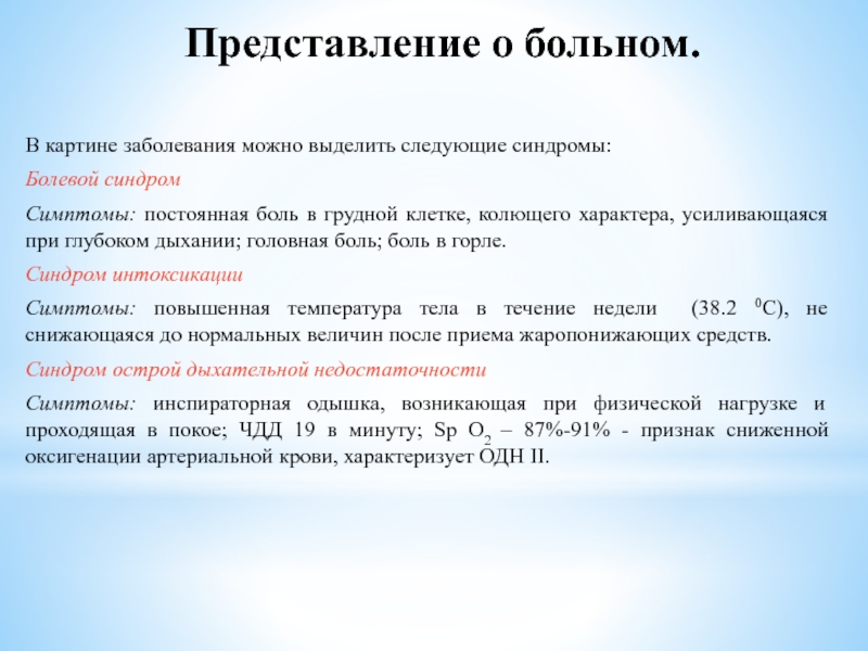 Симптомы: инспираторная одышка, возникающая при физической нагрузке и проходящая в покое; ЧДД 19 в минуту; Sp О2 – 87%-91% - признак сниженной оксигенации артериальной крови, характеризует ОДН II.