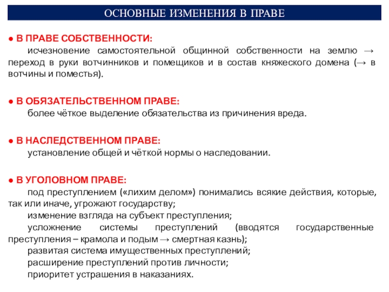 усложнение системы преступлений (вводятся государственные преступления – крамола и подым → смертная казнь);