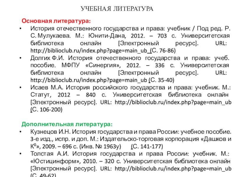Исаев М.А. История российского государства и права: учебник. М.: Статут, 2012 – 840 с. Университетская библиотека онлайн [Электронный ресурс]. URL: http://biblioclub.ru/index.php?page=main_ub (С. 106-200)