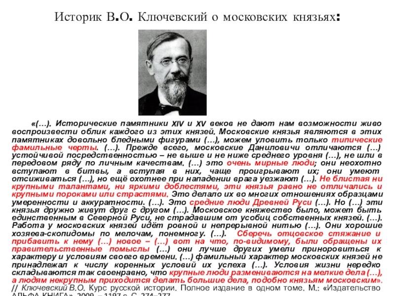 из этих князей. Московские князья являются в этих памятниках довольно бледными фигурами (…), можем уловить только типические фамильные черты. (…). Прежде всего, московские Даниловичи отличаются (…) устойчивой посредственностью – не выше и не ниже среднего уровня (…), не шли в передовом ряду по личным качествам. (…) это очень мирные люди; они неохотно вступают в битвы, а вступая в них, чаще проигрывают их; они умеют отсиживаться (…), но ещё охотнее при нападении врага уезжают (…). Не блистая ни крупными талантами, ни яркими доблестями, эти князья равно не отличались и крупными пороками или страстями. Это делало их во многих отношениях образцами умеренности и аккуратности. (…). Это средние люди Древней Руси (…). Но (…) эти князья дружно живут друг с другом (…). Московское княжество было, может быть единственным в Северной Руси, не страдавшим от усобиц собственных князей. (…). Работа у московских князей идёт ровной и непрерывной нитью (…). Они хорошие хозяева-скопидомы по мелочам, понемногу. (…). Сберечь отцовское стяжание и прибавить к нему (…) новое – (…) вот на что, по-видимому, были обращены их правительственные помыслы (…) они лучше других умели приноровиться к характеру и условиям своего времени. (…) фамильный характер московских князей не принадлежал к числу коренных условий их успеха (…). Условия жизни нередко складываются так своенравно, что крупные люди размениваются на мелкие дела (…), а людям некрупным приходится делать большие дела, подобно князьям московским». // Ключевский В.О. Курс русской истории. Полное издание в одном томе. М.: «Издательство АЛЬФА-КНИГА», 2009. – 1197 с. С. 274–277.
