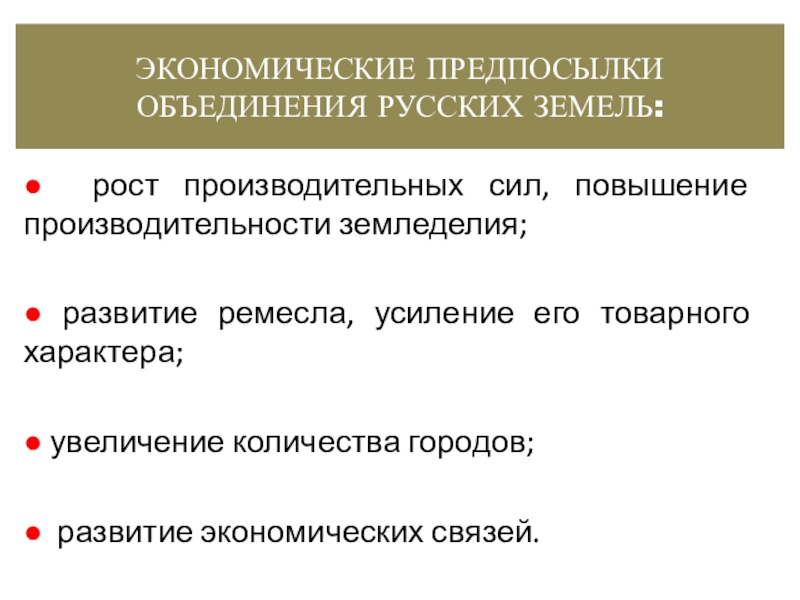 Слайд 5ЭКОНОМИЧЕСКИЕ ПРЕДПОСЫЛКИ ОБЪЕДИНЕНИЯ РУССКИХ ЗЕМЕЛЬ: