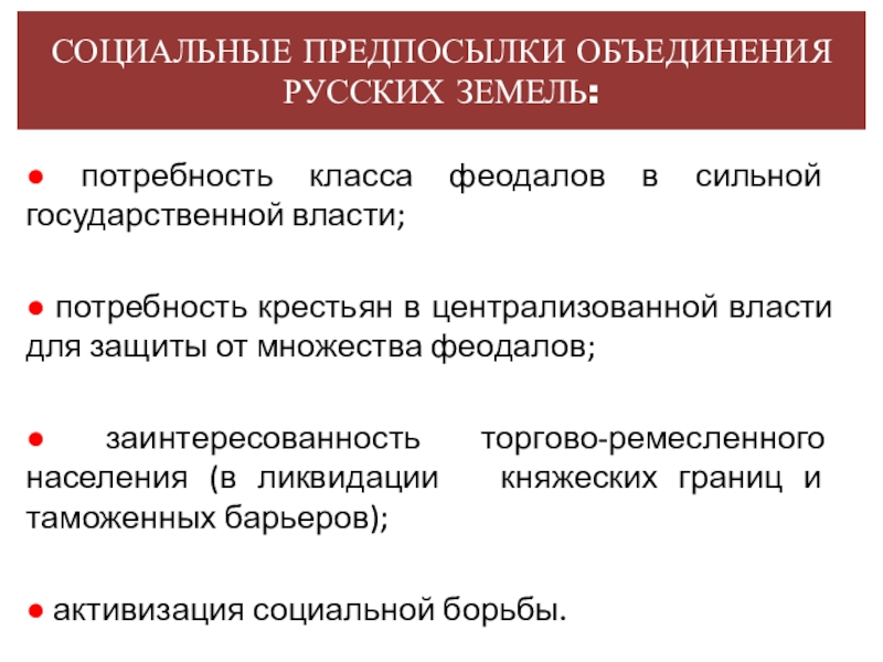 Слайд 7СОЦИАЛЬНЫЕ ПРЕДПОСЫЛКИ ОБЪЕДИНЕНИЯ РУССКИХ ЗЕМЕЛЬ: