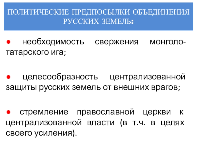 Слайд 6ПОЛИТИЧЕСКИЕ ПРЕДПОСЫЛКИ ОБЪЕДИНЕНИЯ РУССКИХ ЗЕМЕЛЬ: