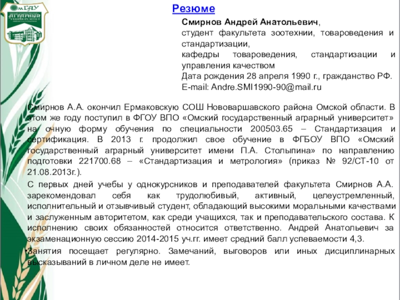 С первых дней учебы у однокурсников и преподавателей факультета Смирнов А.А. зарекомендовал себя как трудолюбивый, активный, целеустремленный, исполнительный и отзывчивый студент, обладающий высокими моральными качествами и заслуженным авторитетом, как среди учащихся, так и преподавательского состава. К исполнению своих обязанностей относится ответственно. Андрей Анатольевич за экзаменационную сессию 2014-2015 уч.гг. имеет средний балл успеваемости 4,3.