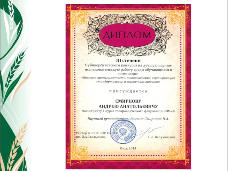 Смирнов А.А. окончил Ермаковскую СОШ Нововаршавского района Омской области. В этом же году поступил в ФГОУ ВПО «Омский государственный аграрный университет» на очную форму обучения по специальности 200503.65 – Стандартизация и сертификация. В 2013 г. продолжил свое обучение в ФГБОУ ВПО «Омский государственный аграрный университет имени П.А. Столыпина» по направлению подготовки 221700.68 – «Стандартизация и метрология» (приказ № 92/СТ-10 от 21.08.2013г.).