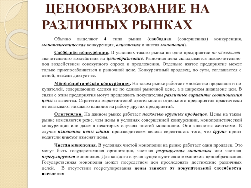 Слайд 6 ЦЕНООБРАЗОВАНИЕ НА РАЗЛИЧНЫХ РЫНКАХ
