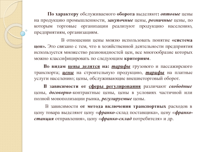 Слайд 5 По характеру обслуживаемого оборота выделяют: оптовые цены на