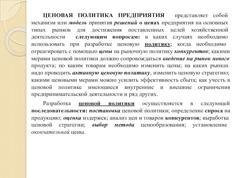 Слайд 7ЦЕНОВАЯ ПОЛИТИКА ПРЕДПРИЯТИЯ представляет собой механизм или модель принятия решений
