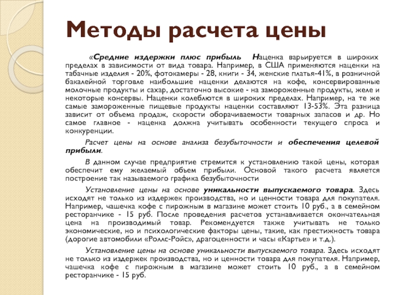 Установление цены на основе уникальности выпускаемого товара. Здесь исходят не только из издержек производства, но и ценности товара для покупателя. Например, чашечка кофе с пирожным в магазине может стоить 10 руб., а в семейном ресторанчике - 15 руб.