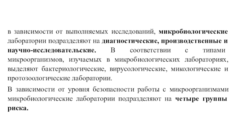 В зависимости от уровня безопасности работы с микроорганизмами микробиологические лаборатории подразделяют на четыре группы риска.