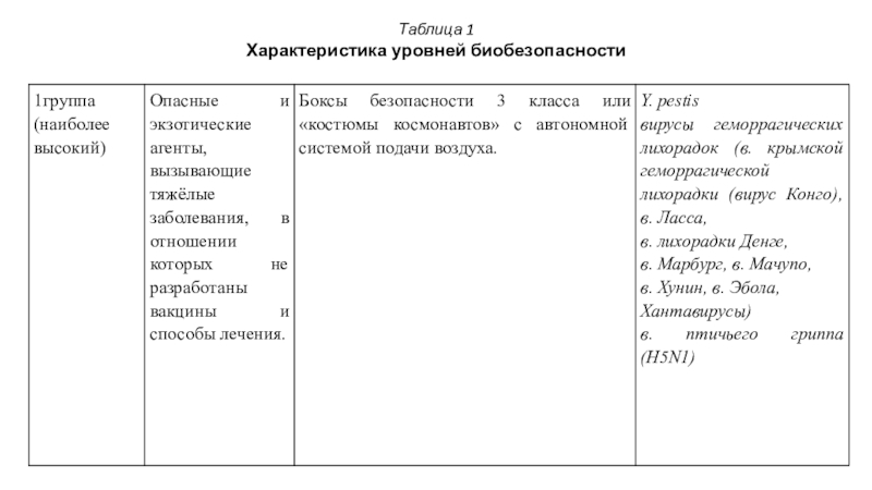 опасными биологическими агентами. Различают 4 уровня биобезопасности (табл. 1). В
