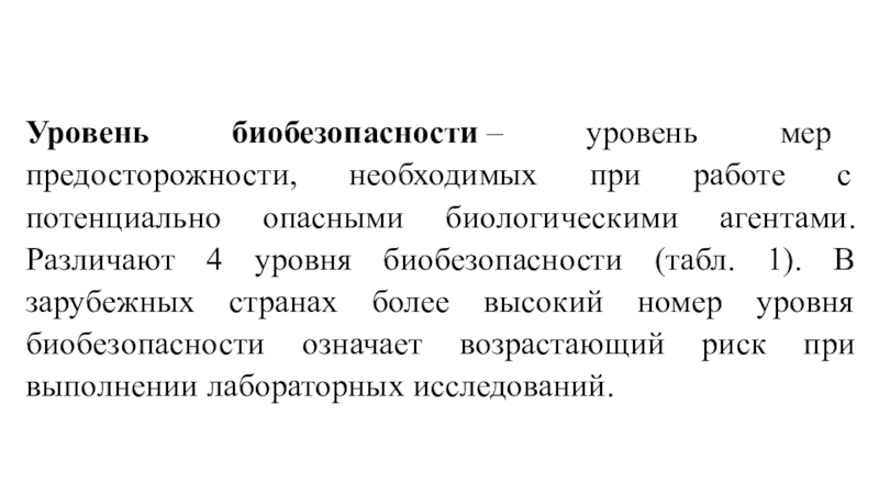 Слайд 4Уровень биобезопасности – уровень мер предосторожности, необходимых при работе с потенциально