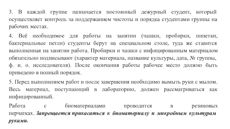 Работа с биоматериалами проводится в резиновых перчатках. Запрещается прикасаться к биоматериалу и микробным культурам руками.