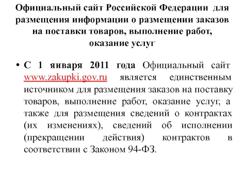 года Официальный сайт www.zakupki.gov.ru является единственным источником для размещения заказов на поставку товаров, выполнение работ, оказание услуг, а также для размещения сведений о контрактах (их изменениях), сведений об исполнении (прекращении действия) контрактов в соответствии с Законом 94-ФЗ.