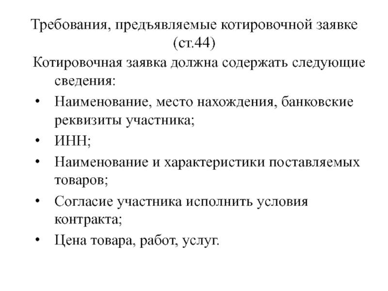 Слайд 105Требования, предъявляемые котировочной заявке (ст.44)
