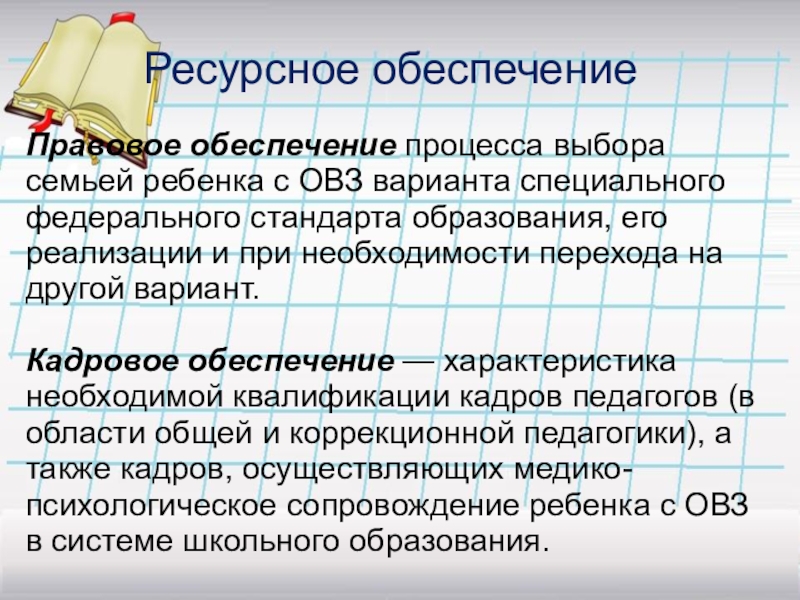 Кадровое обеспечение — характеристика необходимой квалификации кадров педагогов (в области общей и коррекционной педагогики), а также кадров, осуществляющих медико-психологическое сопровождение ребенка с ОВЗ в системе школьного образования.