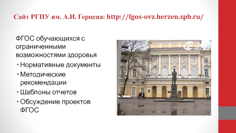 Слайд 10Сайт РГПУ им. А.И. Герцена: http://fgos-ovz.herzen.spb.ru/