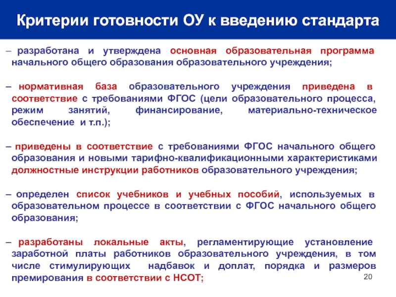 Слайд 20Критерии готовности ОУ к введению стандарта