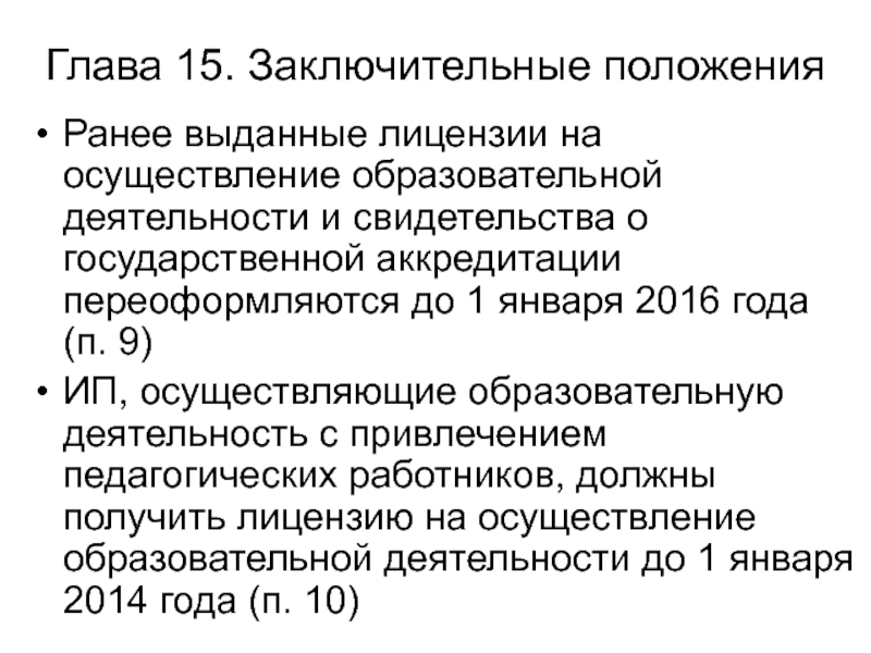 ИП, осуществляющие образовательную деятельность с привлечением педагогических работников, должны получить лицензию на осуществление образовательной деятельности до 1 января 2014 года (п. 10)