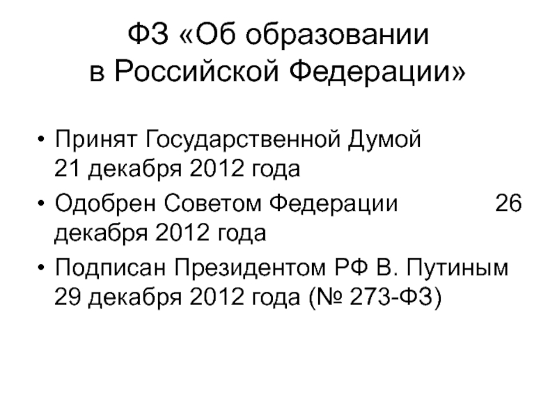 Подписан Президентом РФ В. Путиным 29 декабря 2012 года (№ 273-ФЗ)