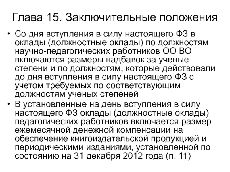 В установленные на день вступления в силу настоящего ФЗ оклады (должностные оклады) педагогических работников включается размер ежемесячной денежной компенсации на обеспечение книгоиздательской продукцией и периодическими изданиями, установленной по состоянию на 31 декабря 2012 года (п. 11)