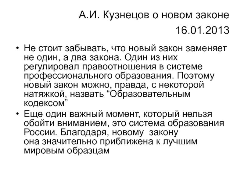 в системе профессионального образования. Поэтому новый закон можно, правда, с некоторой натяжкой, назвать “Образовательным кодексом”