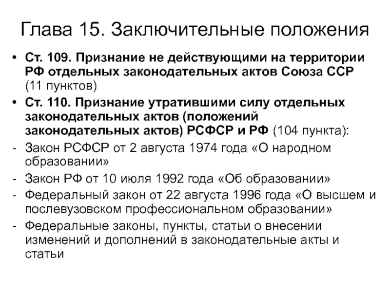 утратившими силу отдельных законодательных актов (положений законодательных актов) РСФСР и РФ (104 пункта):