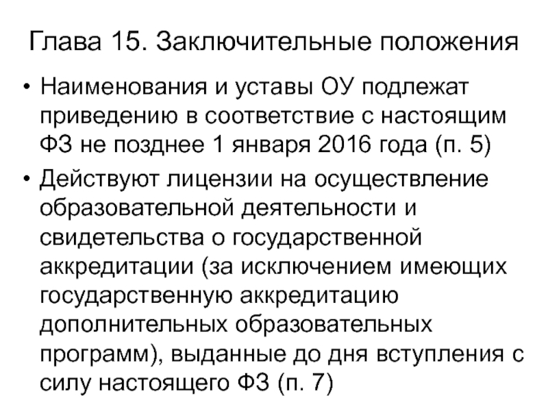 Действуют лицензии на осуществление образовательной деятельности и свидетельства о государственной аккредитации (за исключением имеющих государственную аккредитацию дополнительных образовательных программ), выданные до дня вступления с силу настоящего ФЗ (п. 7)
