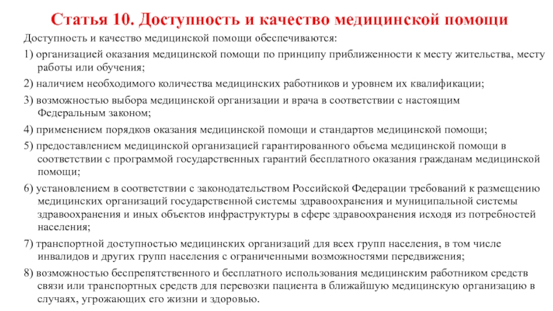 Слайд 7Статья 10. Доступность и качество медицинской помощи