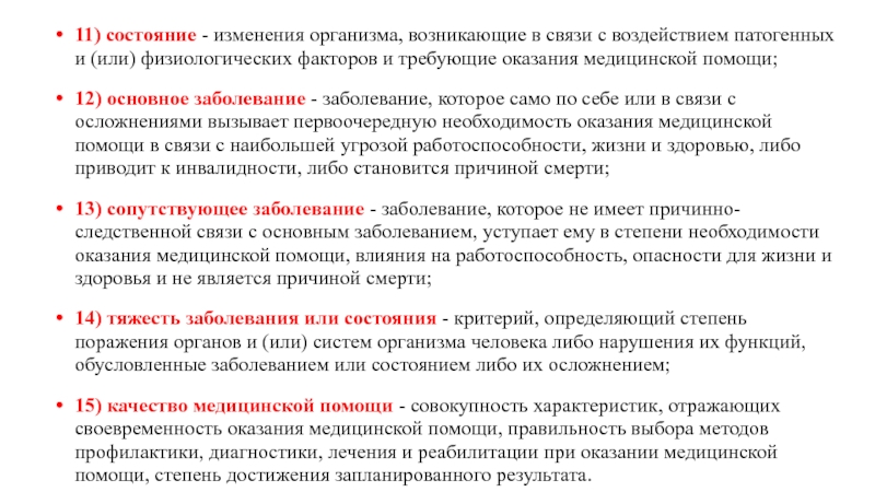 13) сопутствующее заболевание - заболевание, которое не имеет причинно-следственной связи с основным заболеванием, уступает ему в степени необходимости оказания медицинской помощи, влияния на работоспособность, опасности для жизни и здоровья и не является причиной смерти;