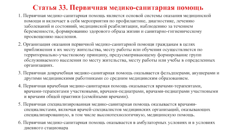 Слайд 15Статья 33. Первичная медико-санитарная помощь