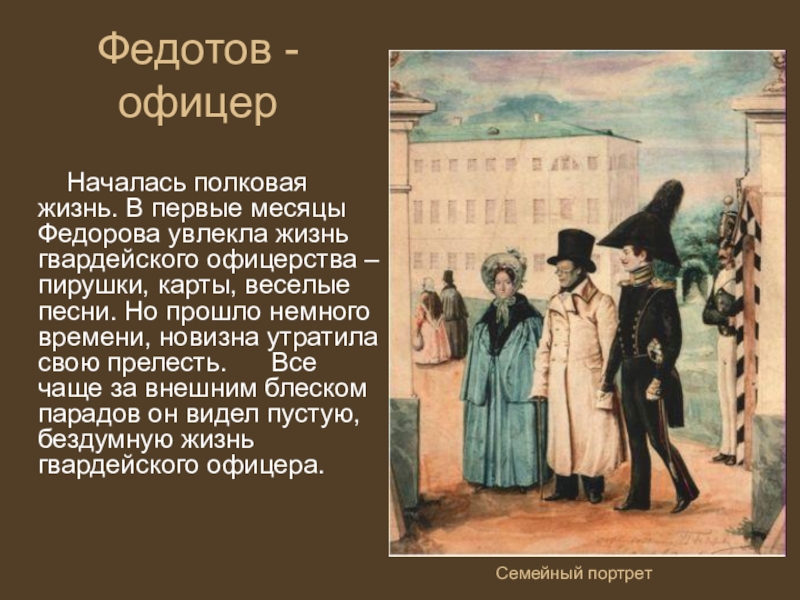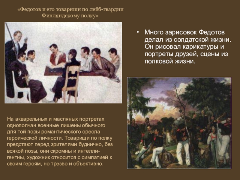 Много зарисовок Федотов делал из солдатской жизни. Он рисовал карикатуры и портреты друзей, сцены из полковой жизни.