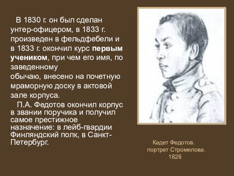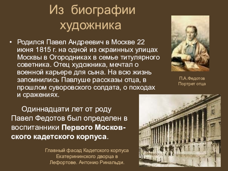 Одиннадцати лет от роду Павел Федотов был определен в воспитанники Первого Москов-ского кадетского корпуса.