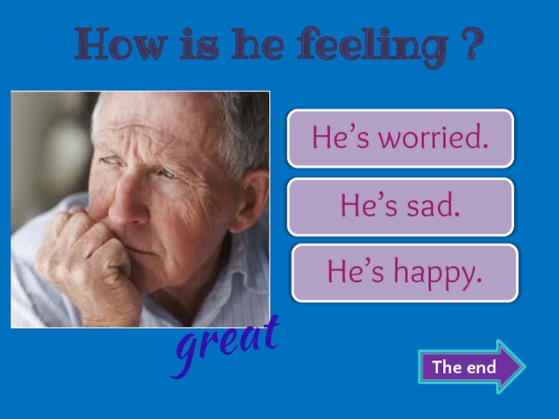 He’s worried.He’s sad.He’s happy.The endgreatHow is he feeling ?