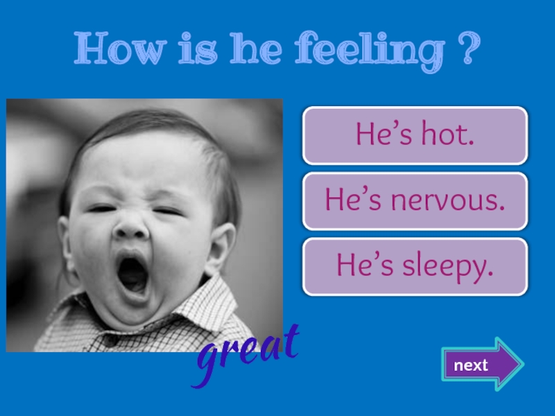 He’s hot.He’s nervous.He’s sleepy. nextgreatHow is he feeling ?