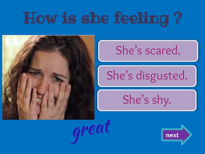 She’s scared.She’s disgusted.She’s shy. nextgreatHow is she feeling ?
