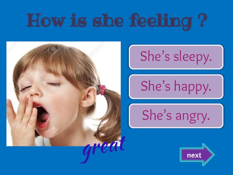 She’s sleepy.She’s happy.She’s angry.nextgreatHow is she feeling ?