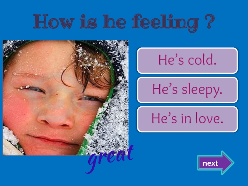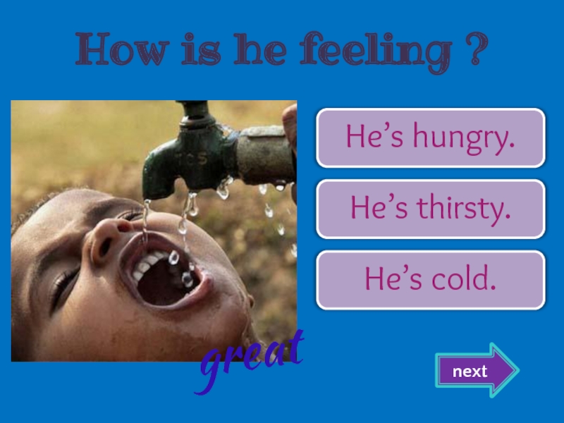 He’s hungry.He’s thirsty.He’s cold.nextgreatHow is he feeling ?