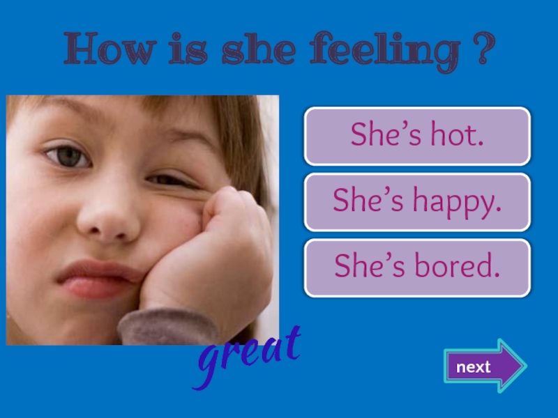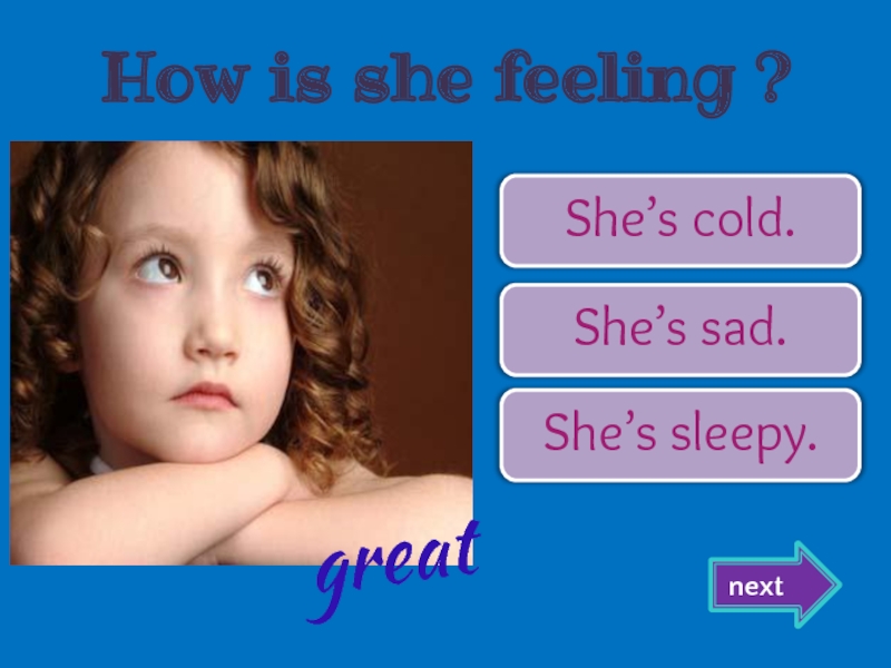 She’s cold.She’s sad.She’s sleepy. nextgreatHow is she feeling ?