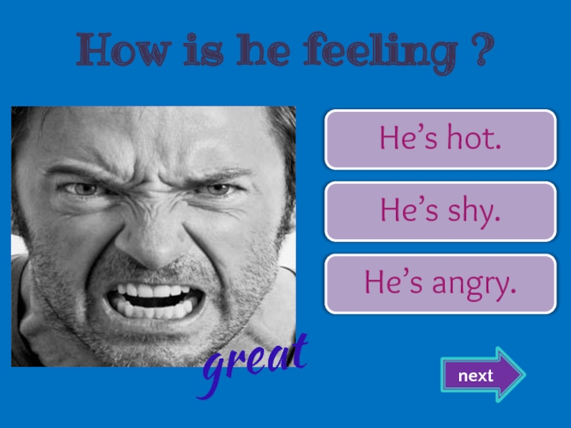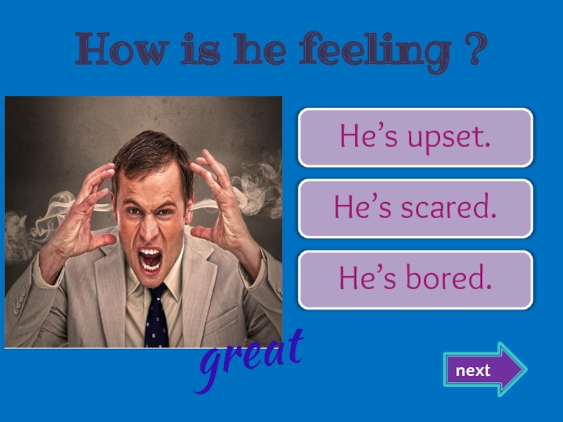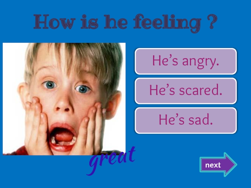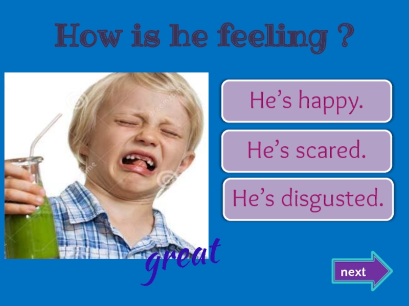 He’s happy.He’s scared.He’s disgusted. nextgreatHow is he feeling ?