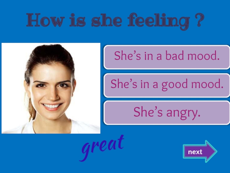 She’s in a bad mood.She’s in a good mood.She’s angry. nextgreatHow is she feeling ?