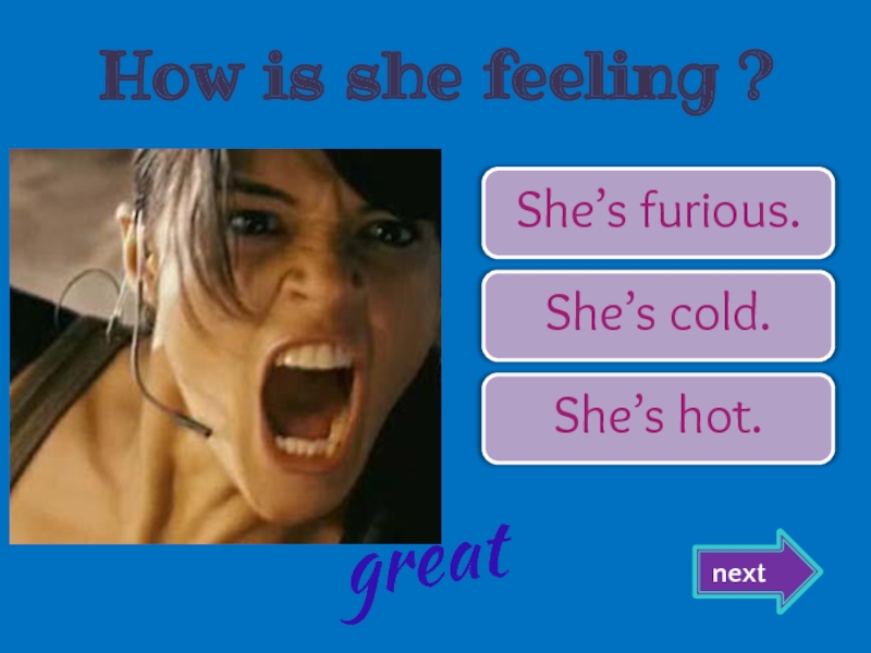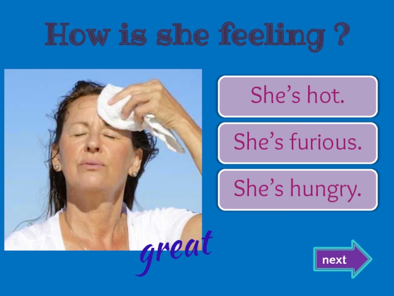 She’s hot.She’s furious.She’s hungry. nextgreatHow is she feeling ?