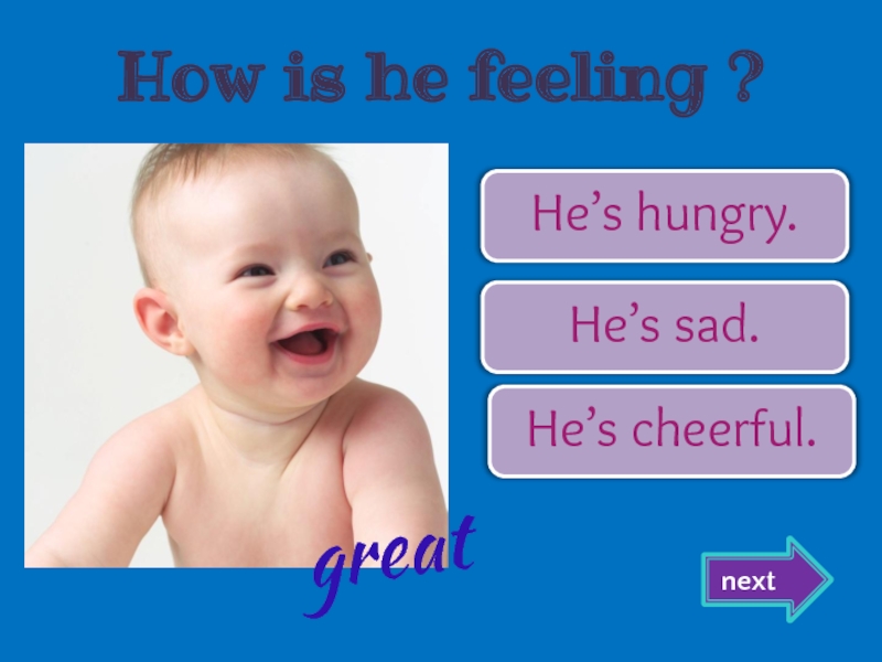He’s hungry.He’s sad.He’s cheerful. nextgreatHow is he feeling ?