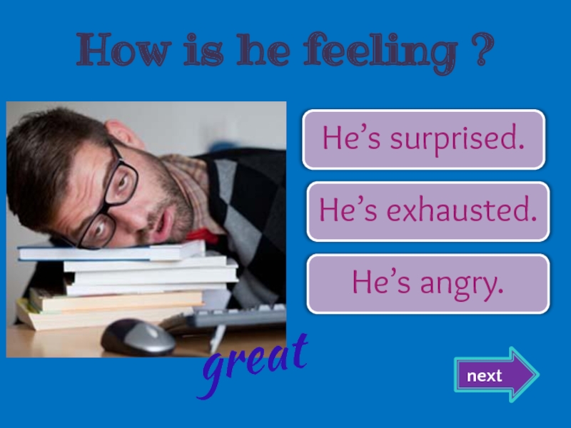 He’s surprised.He’s exhausted.He’s angry. nextgreatHow is he feeling ?